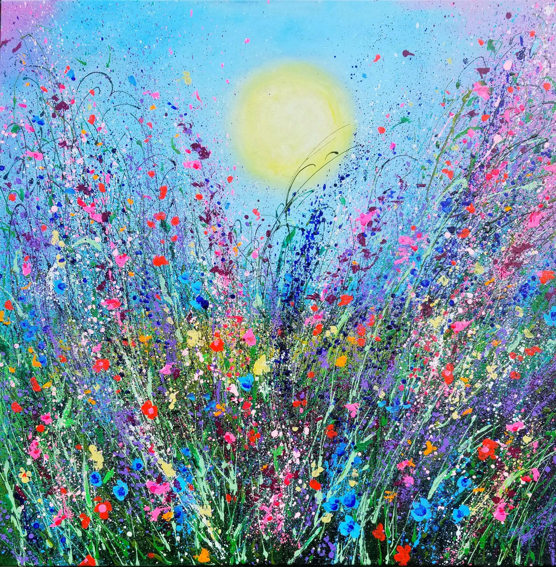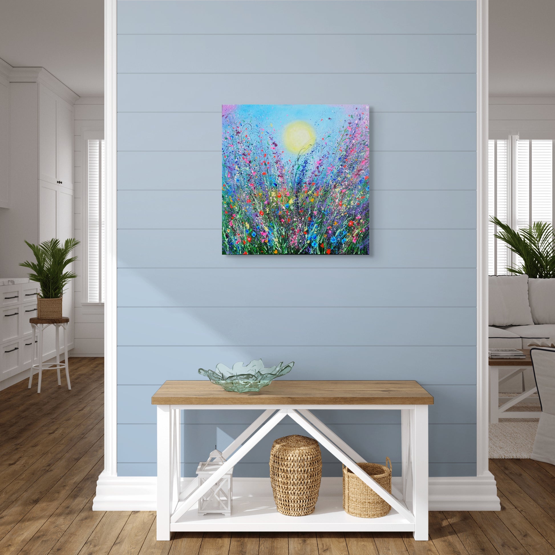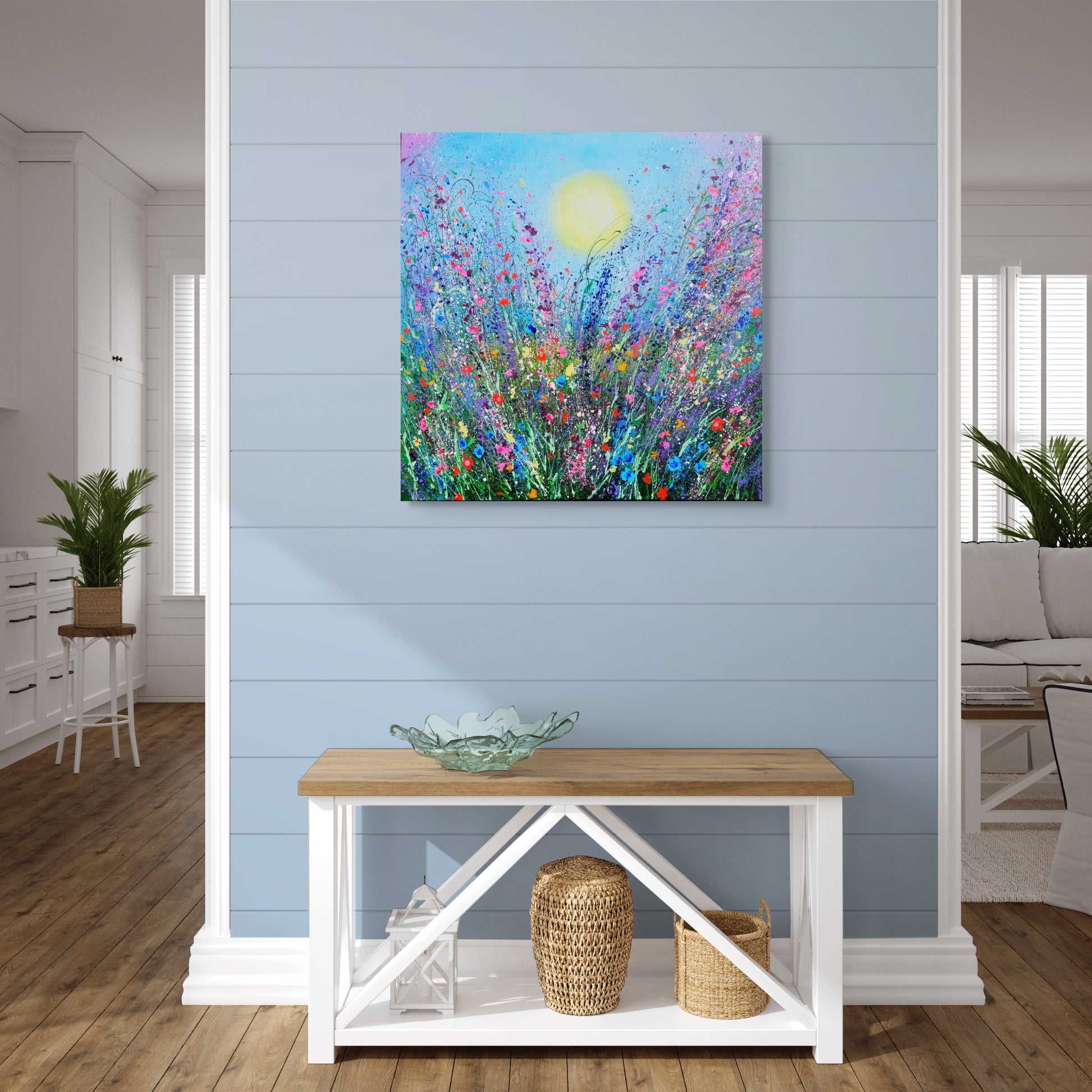 Experience the beauty and vibrancy of nature with this stunning unframed Fine Art Print on Archival Paper of an expressive floral painting. The colorful wildflowers, blue sky, and radiant sun are captured in all its glory, creating a joyful and uplifting piece of art. This piece adds a touch of elegance, making it a perfect addition to any space. This print will bring an instant burst of happiness to your home.